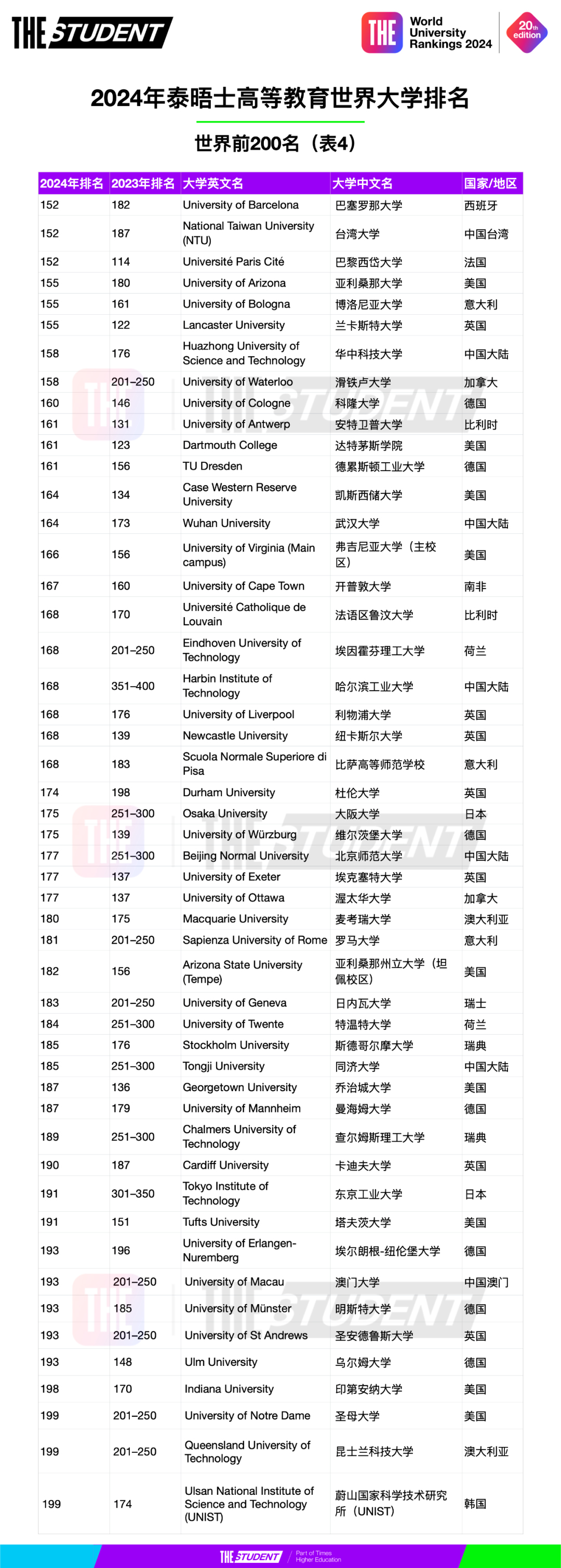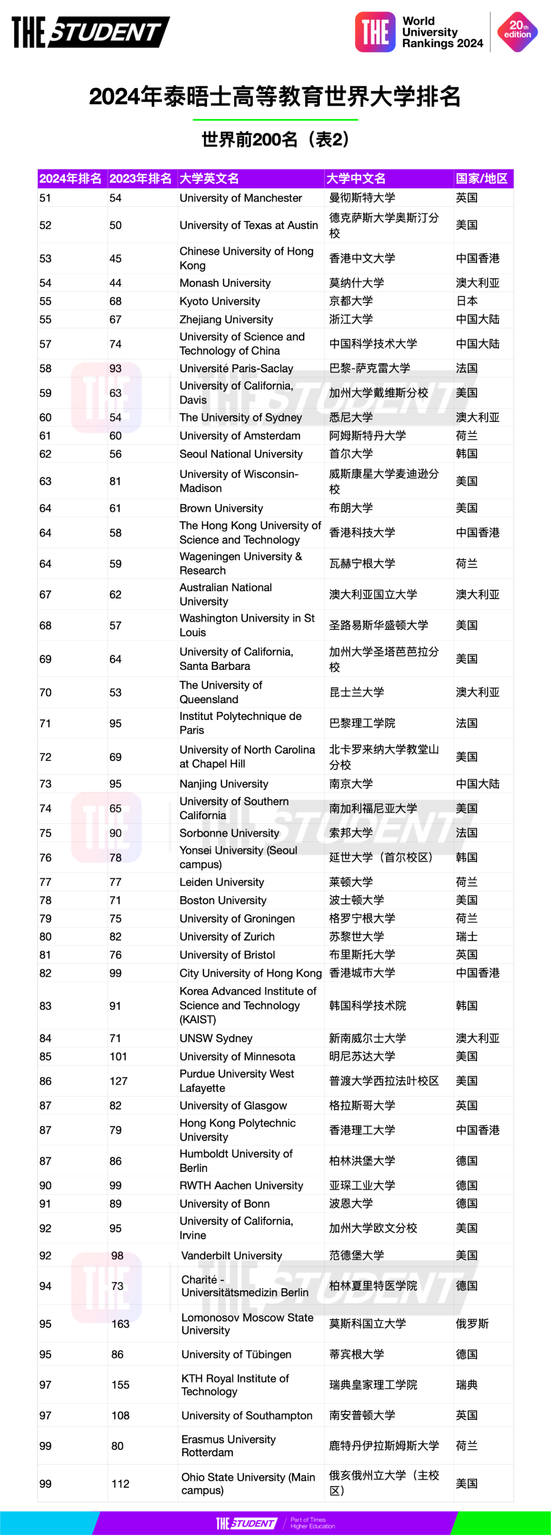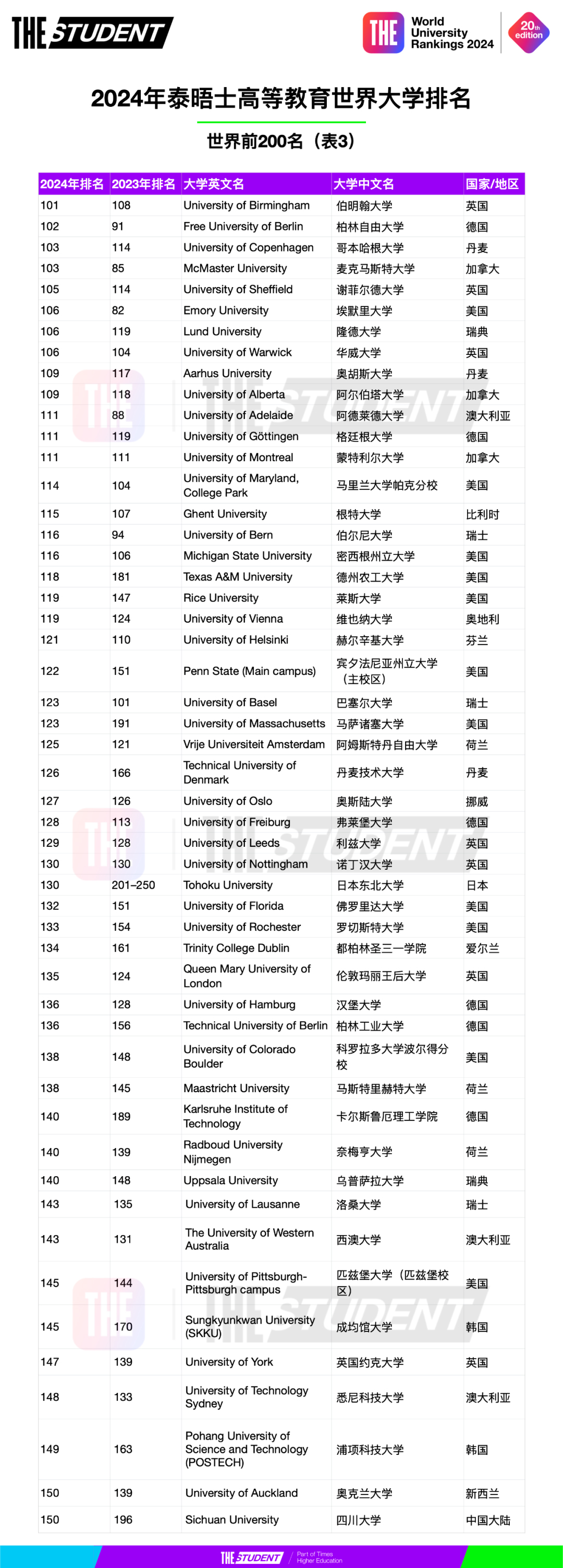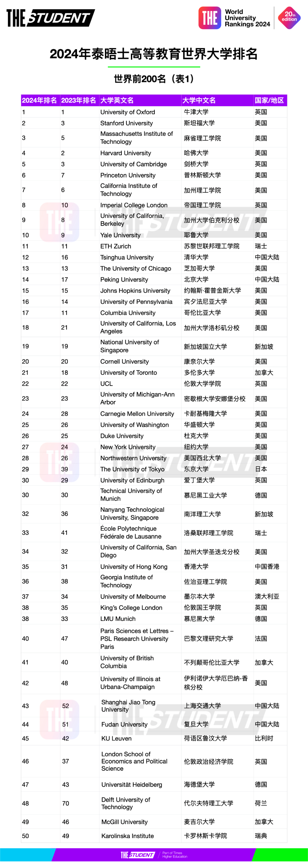 2024年度泰晤士高等教育世界大学排名于2023年9月27日正式发布。今年是该排名的第 20 届,共有来自 108 个国家和地区的 1,904 所大学上榜,较去年的 1,799 所大学参与量进一步提升。