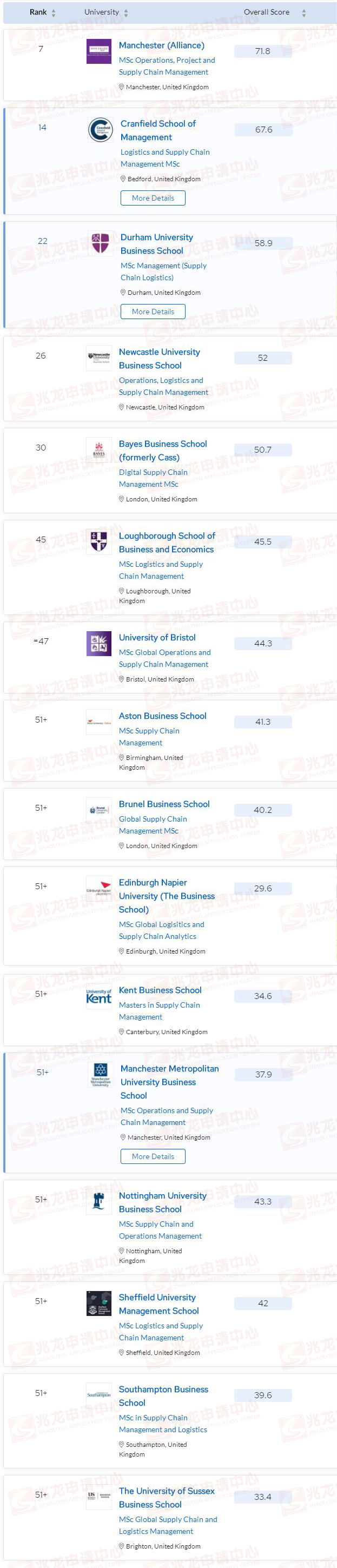 排名前百中,英国一共有16所大学上榜,其中排名最高的是曼彻斯特商学院(7),其次为克兰菲尔德商学院(14)、杜伦商学院(22)、纽卡斯尔商学院(26)。
