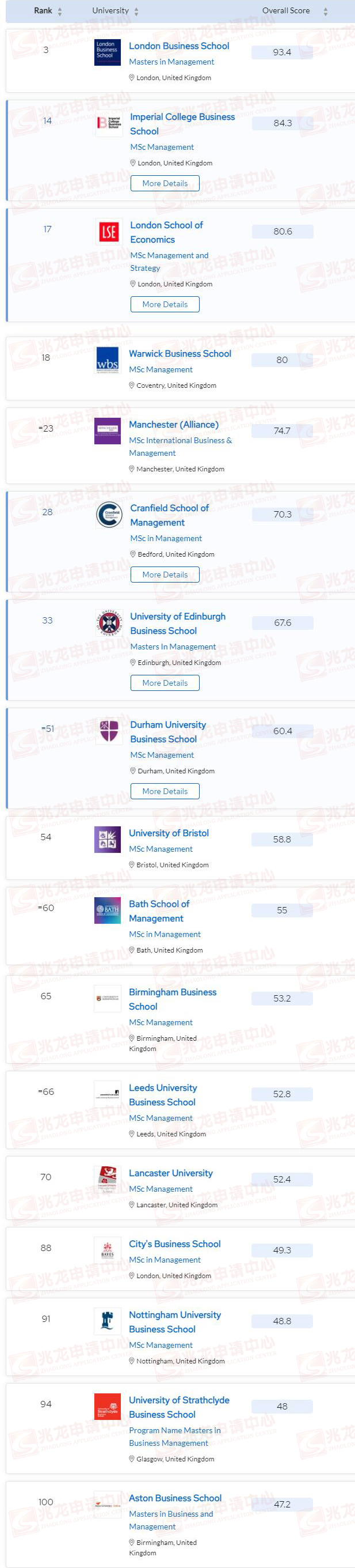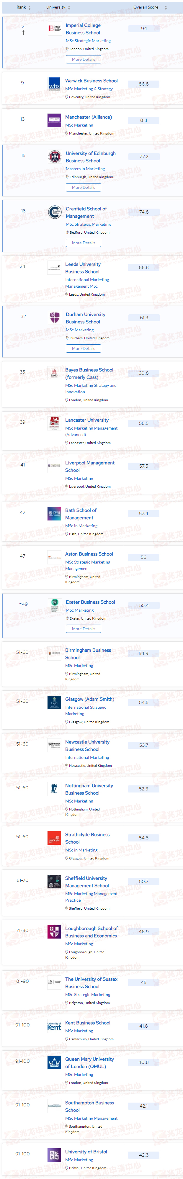 排名前百中,英国一共有31所学校上榜,其中排名前30的依次为:伦敦商学院(3)、帝国理工商学院(14)、伦敦政治经济学院(17)、华威商学院(18)、曼彻斯特商学院(23)、克兰菲尔德商学院(28)。