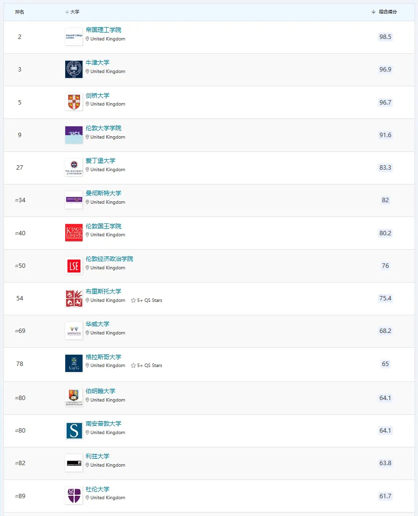 (进入前100的英国院校)