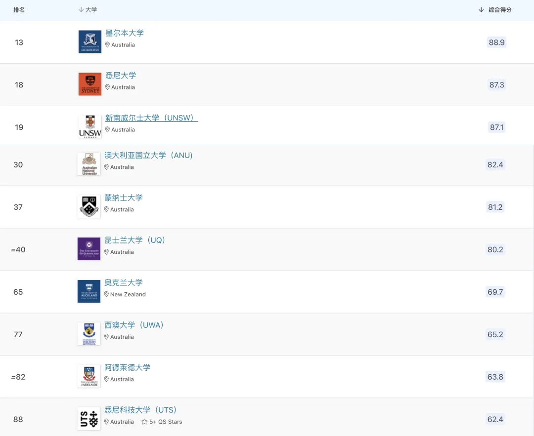 莫纳什大学上升5位,位列第37名;昆士兰大学上升3位至第40位;阿德莱德大学上升7位至第82位;悉尼科技大学上升2位,排名第88。