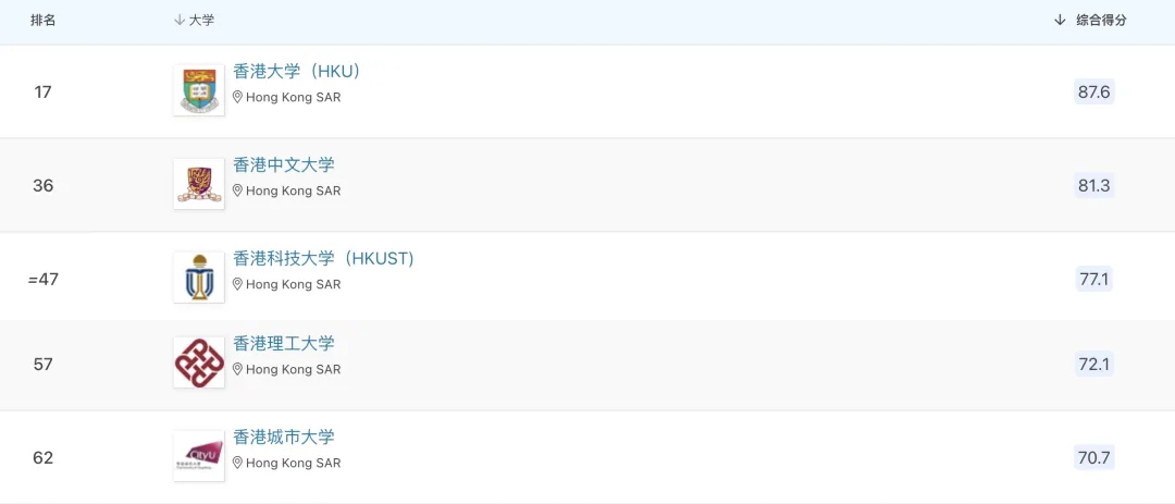 在中国香港地区排名最高的是香港大学,第17名,今年上升9名。