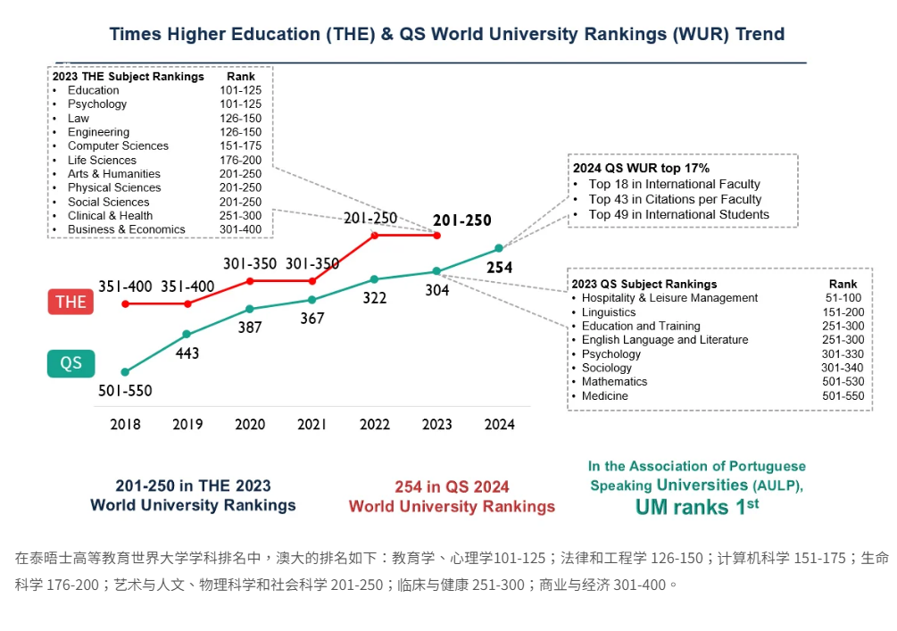 澳门大学(UM)成立于1981年,是澳门唯一一所具有现代化管理模式的国际化公立综合性大学。其80%的教职员工来自澳门以外地区。该大学以英语为主要教学语言,致力于培养具有全球思维和国际竞争力的富有创造力和社会责任感的毕业生。