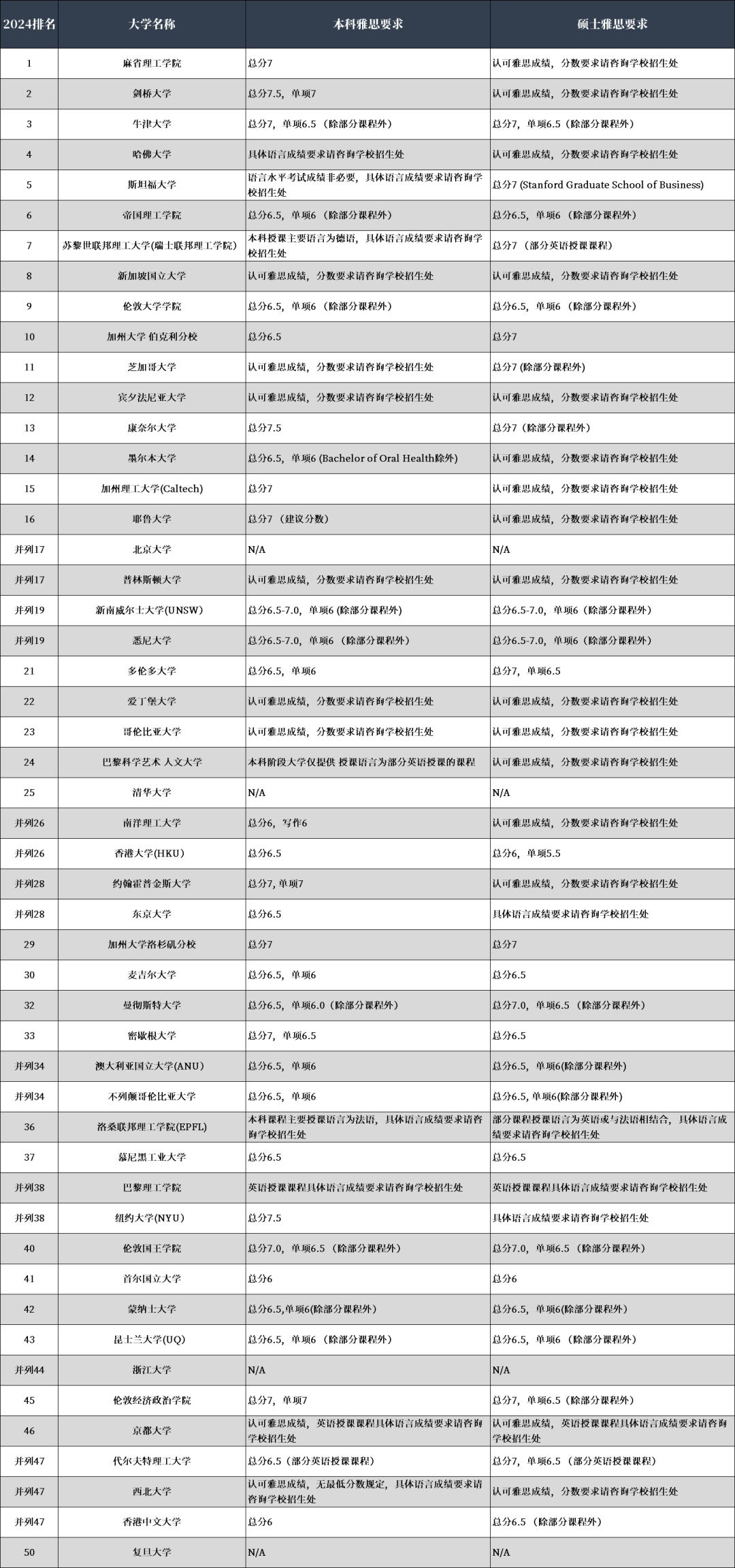 今天,兆龙留学就为大家汇总2024QS排名TOP50的院校对雅思、托福成绩的要求,一起来看看吧。